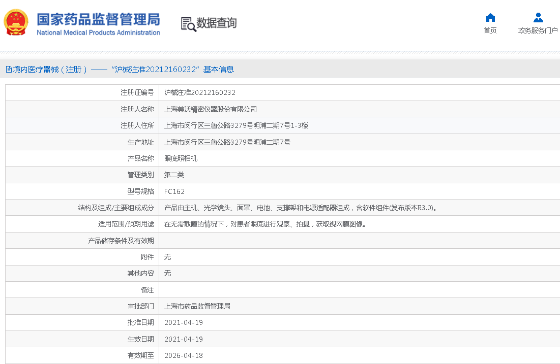 视力筛查仪 注册证编号:沪械注准20212160232
