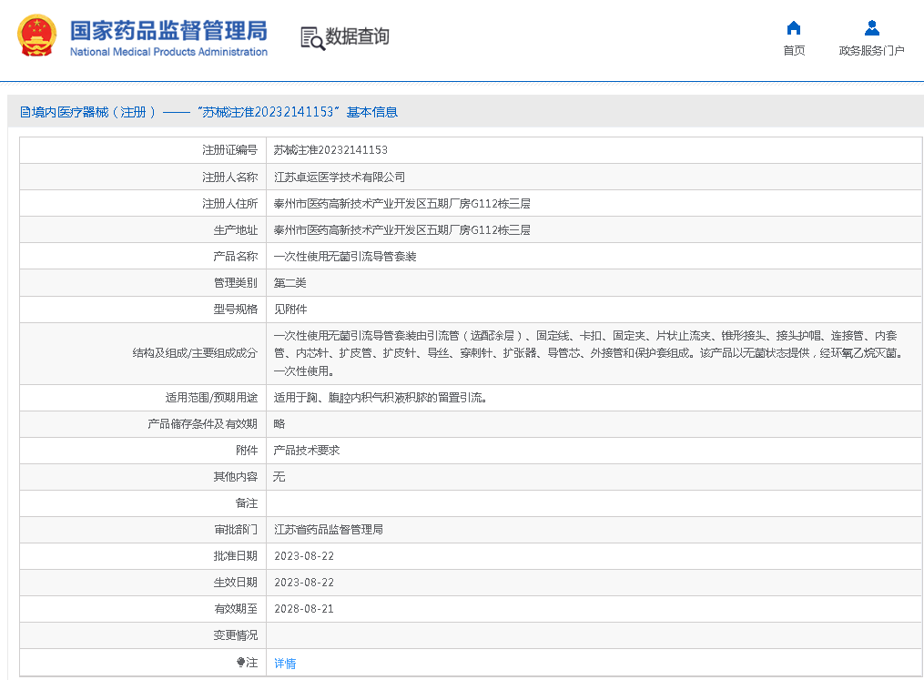 一次性使用无菌引流导管套装由引流管(选配涂层)、固定线、卡扣、固定夹、片状止流夹、锥形接头、接头护帽、连接管、内套管、内芯针、扩皮管、扩皮针、导丝、穿刺针、扩张器、导管芯、外接管和保护套组成。产品以无菌状态提供,经环氧乙烷灭菌。一次性使用。