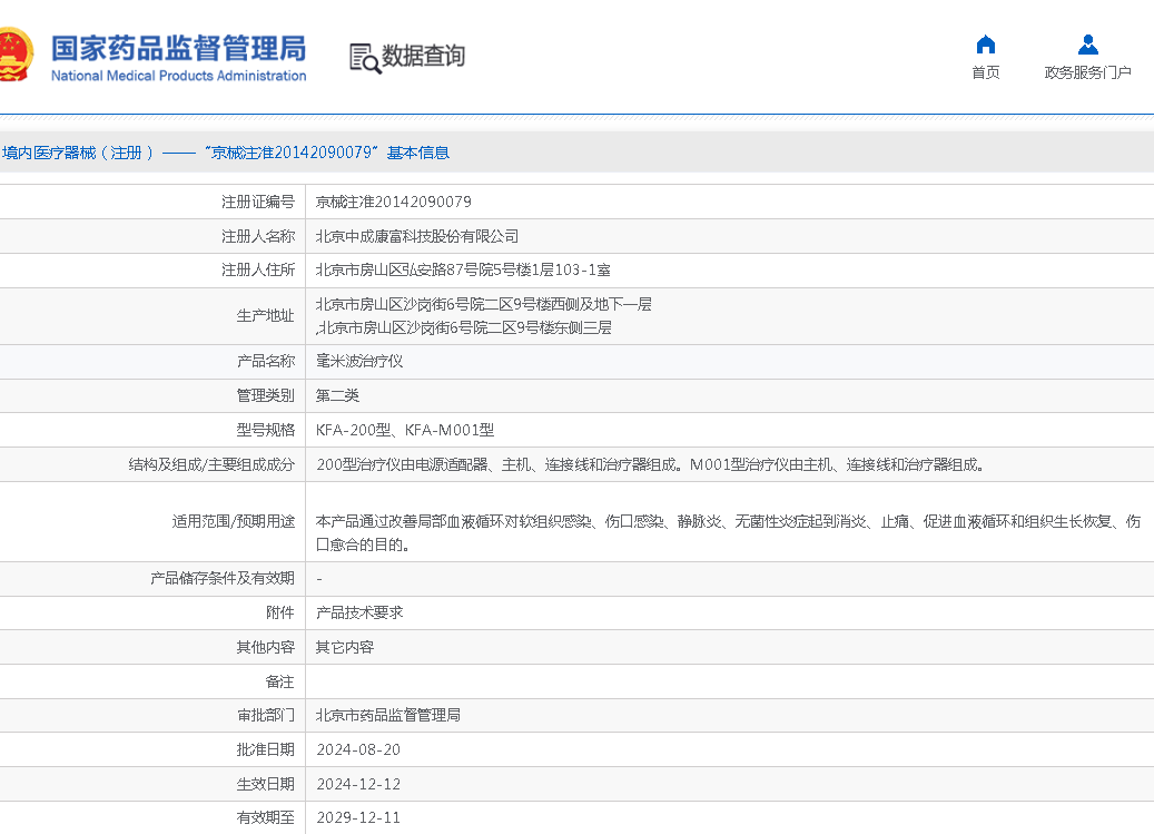 毫米波治疗仪 注册证编号:京械注准20142090079